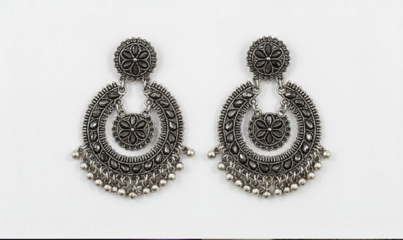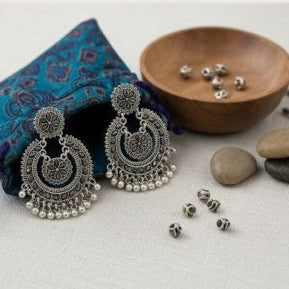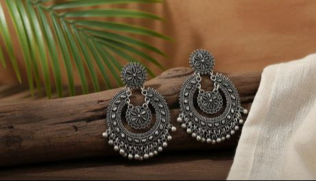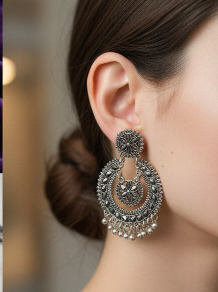 Crafted with a stunning antique oxidized finish, the Naivah Chandbalis are not just accessories; they are a statement. They are the perfect centerpiece for your Navratri lehenga, the ideal companion for your saree, and the ultimate expression of regal elegance at any wedding or celebration.