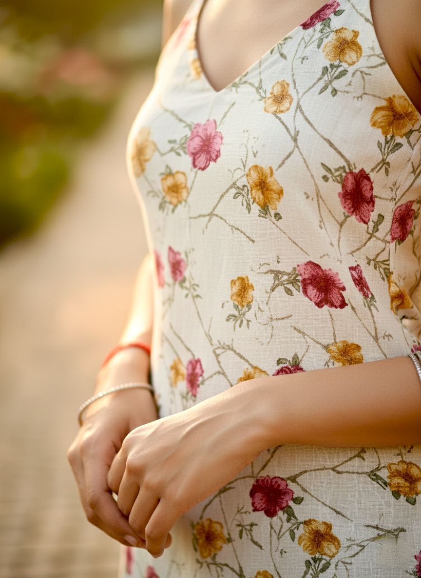 A charming off-white floral tunic featuring delicate spaghetti straps and a flattering V-neck. Perfect for an effortlessly chic and comfortable everyday look.